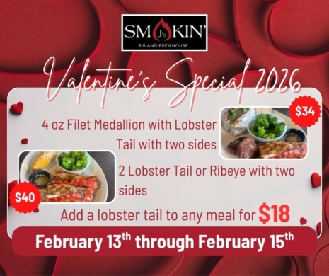 Join us February 13–15 and celebrate with a meal meant to be enjoyed together. From perfectly portioned 4 oz. medallions with a decadent lobster tail to a hearty ribeye or double-tail option, each special includes two delicious sides, with the option to add an extra tail for just $18.